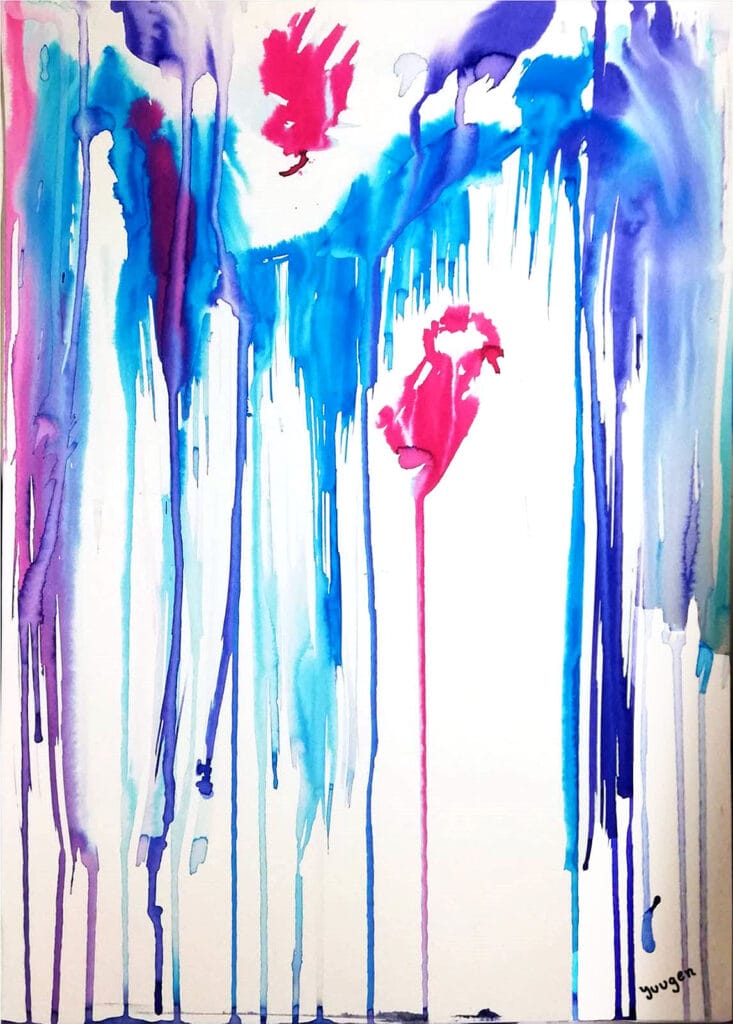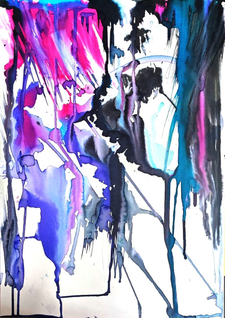 Tintas ecoline azul y tinta negra sobre papel<br/>