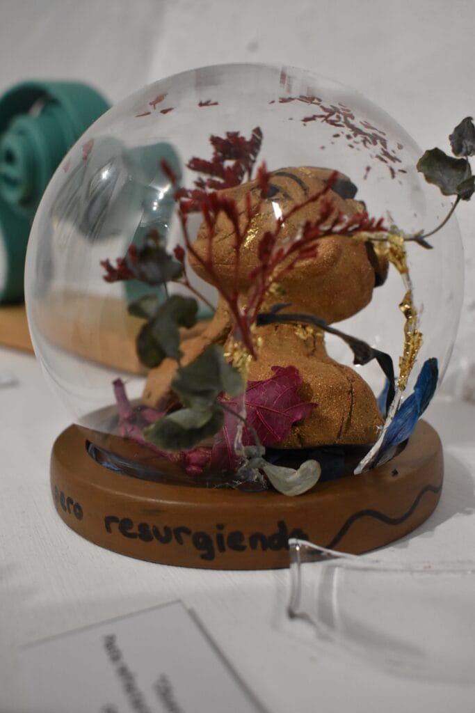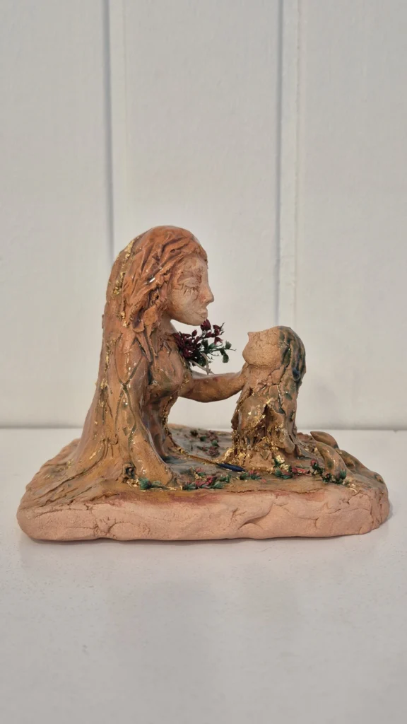 Tamaño: 7x10cm + cúpula de cristal de 12,5x11,5cm. Terracota con óxidos y pan de oro. Año: 2024. 250€