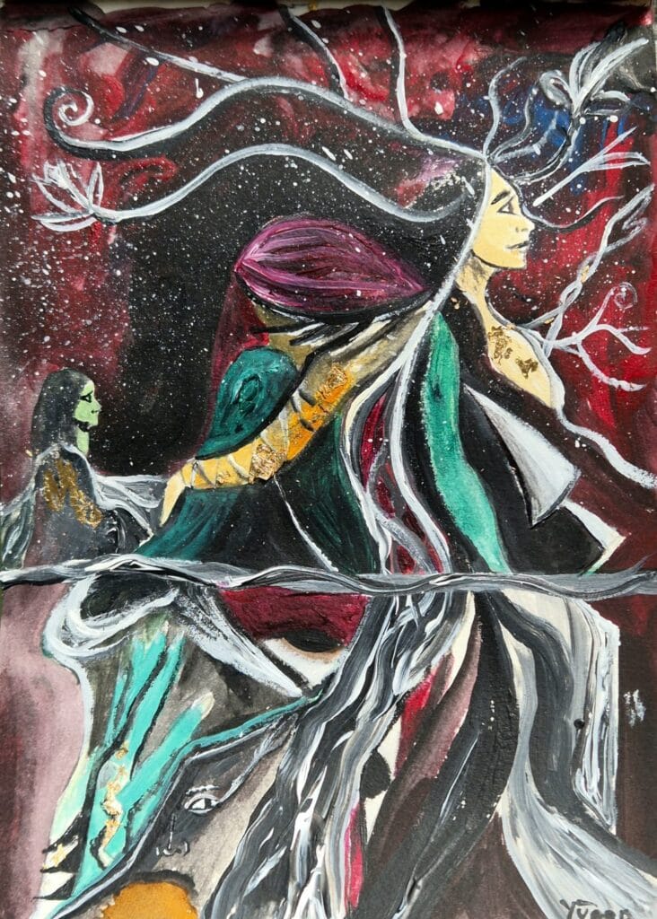 Tamaño: 14,8x21cm. Acrílico, acuarelas y rotulador con pan de oro. Año: 2025. 150€